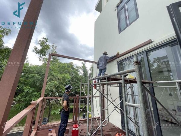 Sau khi hoàn thiện sàn gỗ ngoài trời, bắt đầu dựng hệ cột, đà giàn hoa