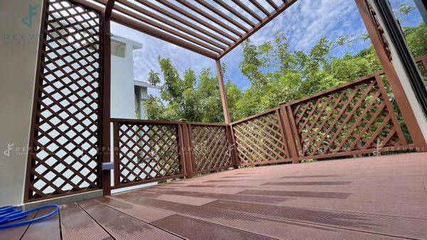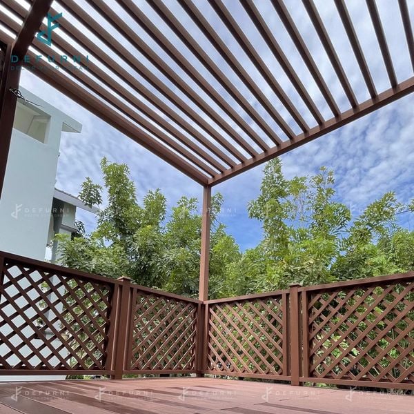 Không gian được mở rộng và thoáng mát hơn với hệ giàn hoa pergola và sàn gỗ nhựa