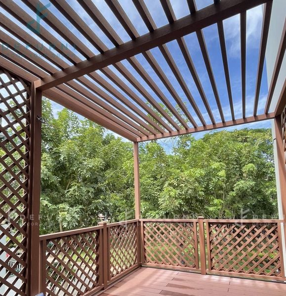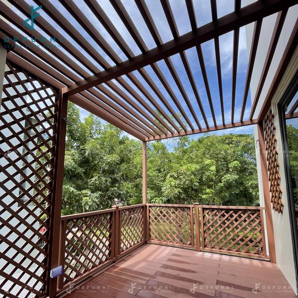 Ngôi nhà trở nên nổi bật và sang trọng hơn với hệ lam gỗ chắn nắng và giàn hoa pergola gỗ nhựa