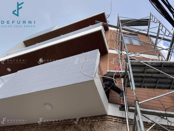 Ngôi nhà trở nên nổi bật khi ốp vách và trần ban công bằng tấm ốp gỗ nhựa eWood