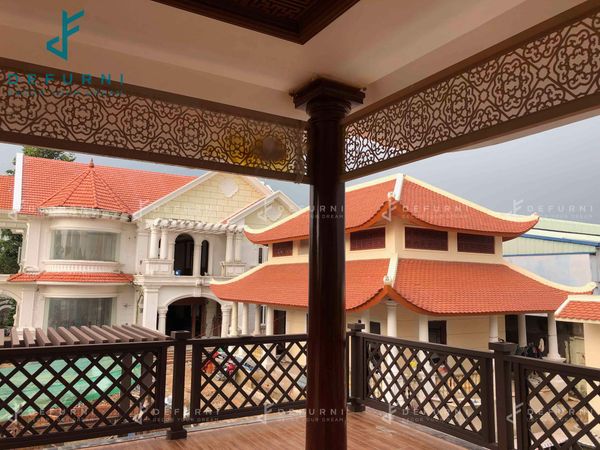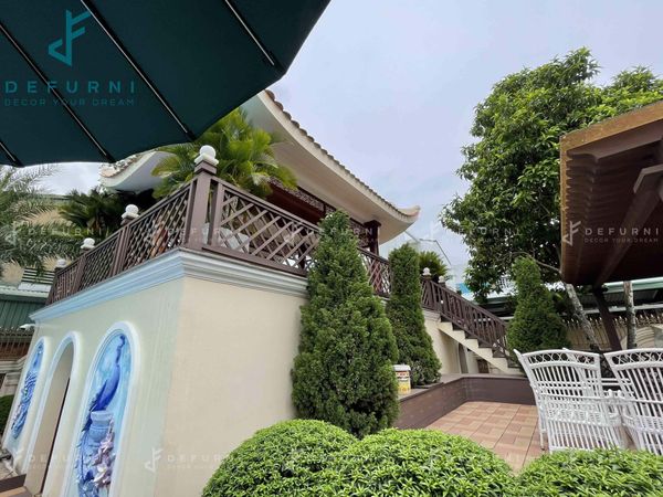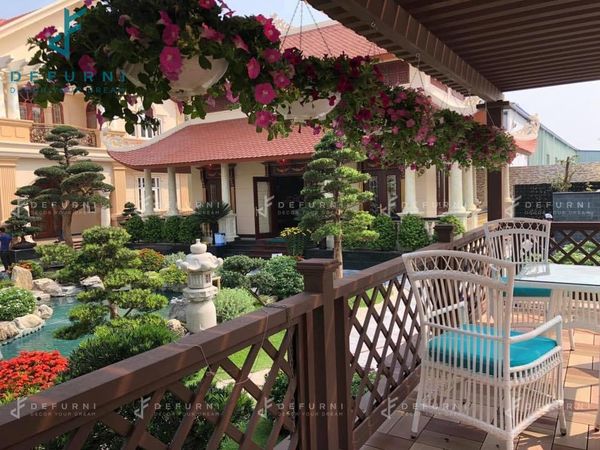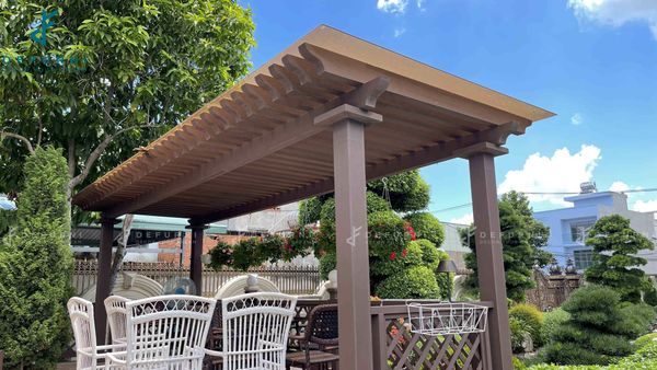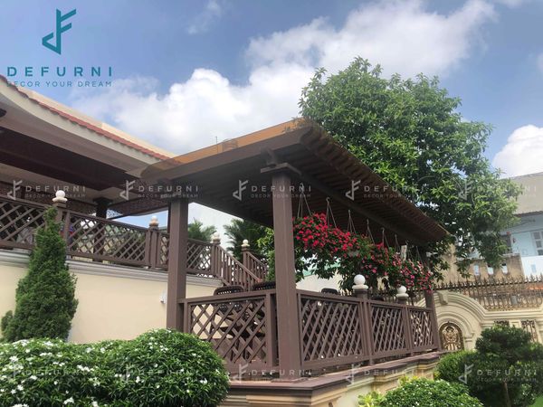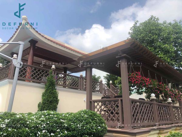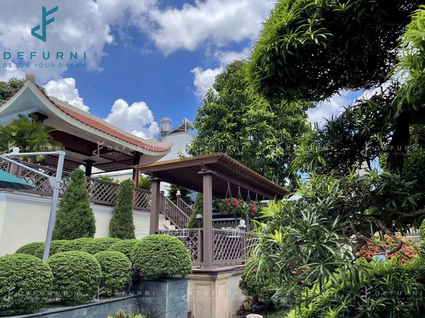 Khuôn viên biệt thự có giàn hoa Pergola và chòi nghỉ mát