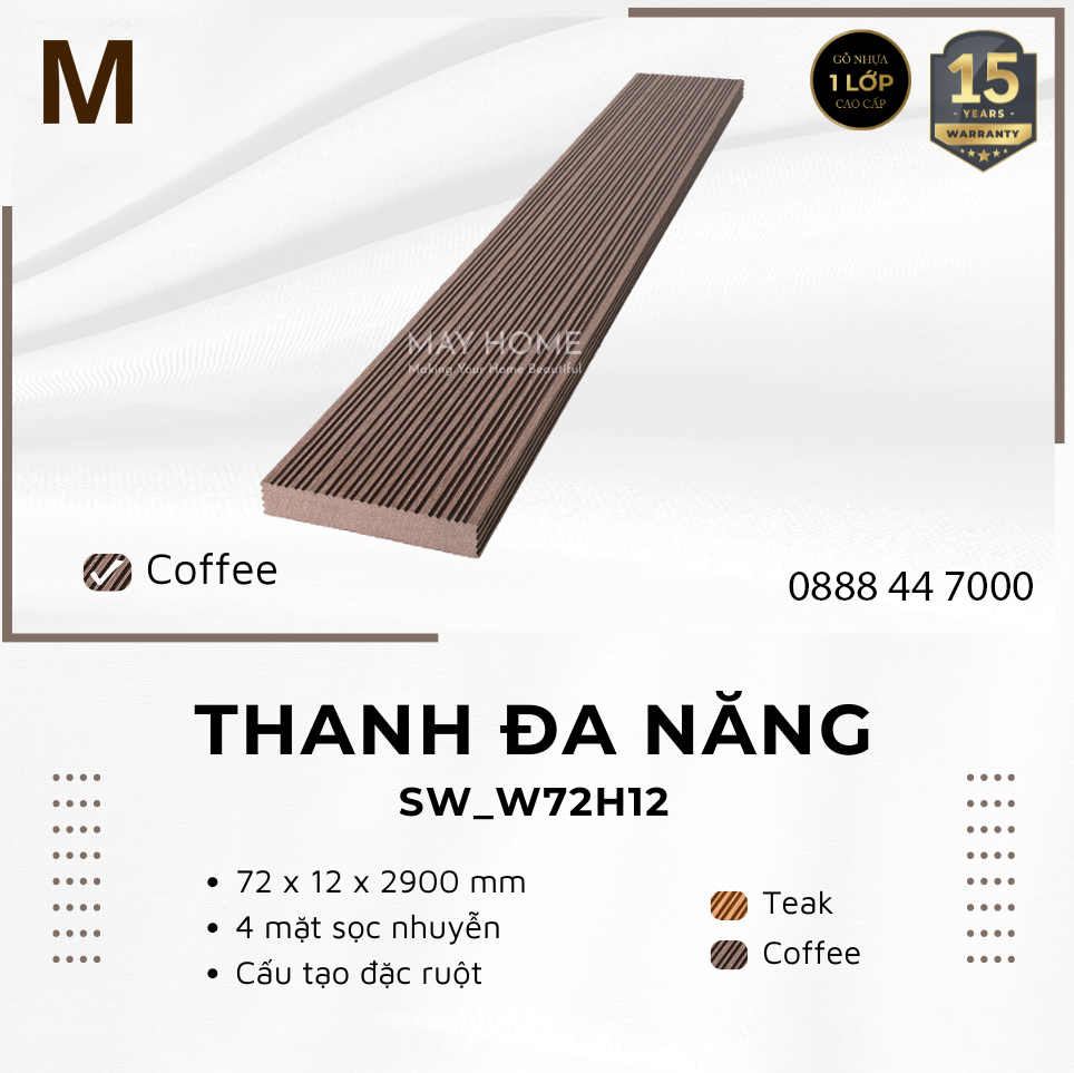 Thanh gỗ nhựa đa năng thương hiệu Southwood mã hiệu SW_W72H12, có kích thước 72x12x2900mm. Thanh gỗ nhựa 72x12mm rất được ưa chuộng làm hàng rào, vách ngăn che cục nóng máy lạnh, vách tường treo chậu cây ở khu vực ban công,...bởi ưu điểm nhỏ gọn, tiện lợi, dễ dàng thi công lắp đặt, ít chi phí bảo trì, sơn sửa, giá thành cũng rất phù hợp túi tiền người tiêu dùng Việt Nam